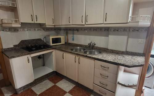 El baño ha sido reformado recientemente. La cocina también ha sido actualizada, aunque los muebles presentan cierto desgaste por el uso.